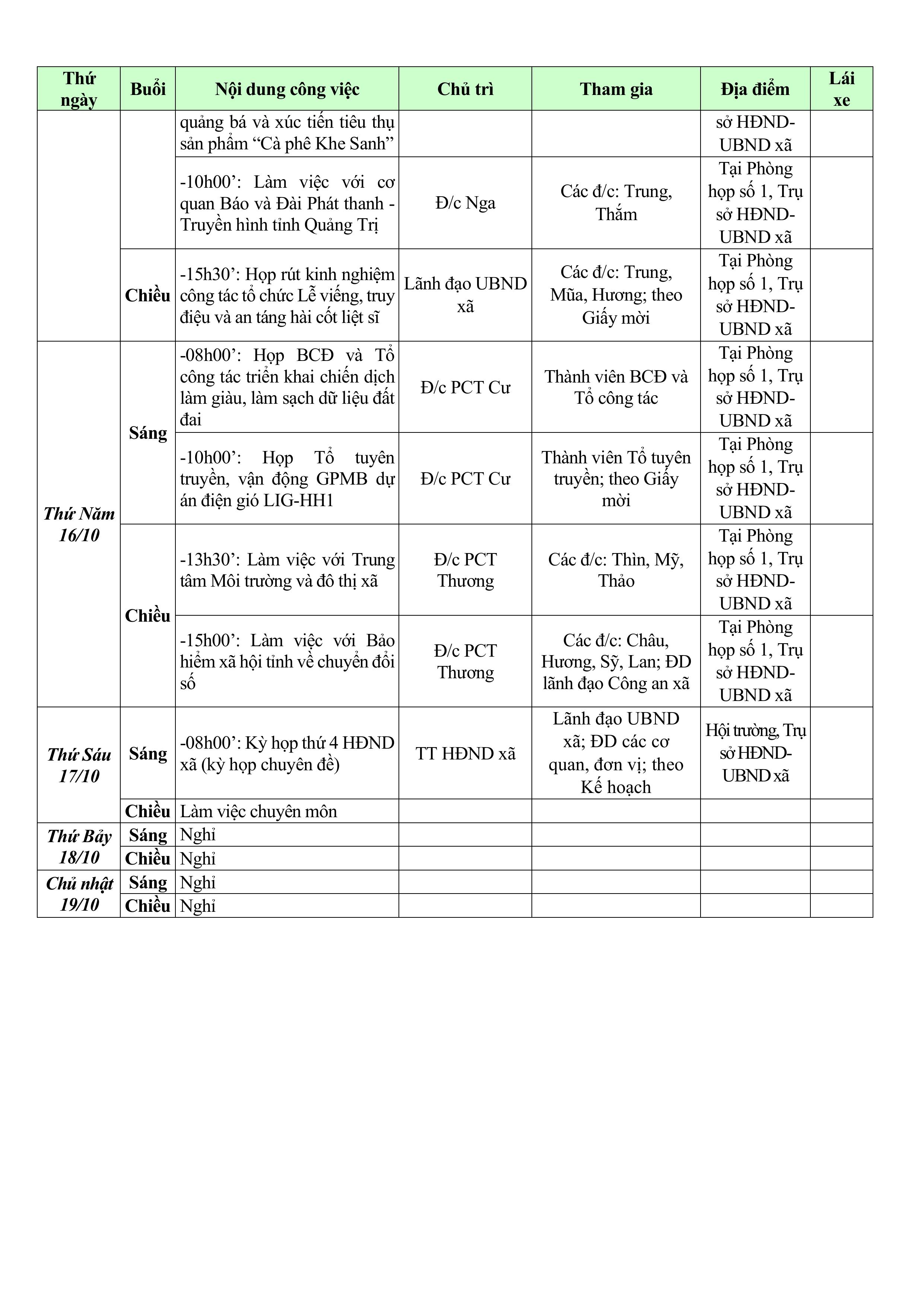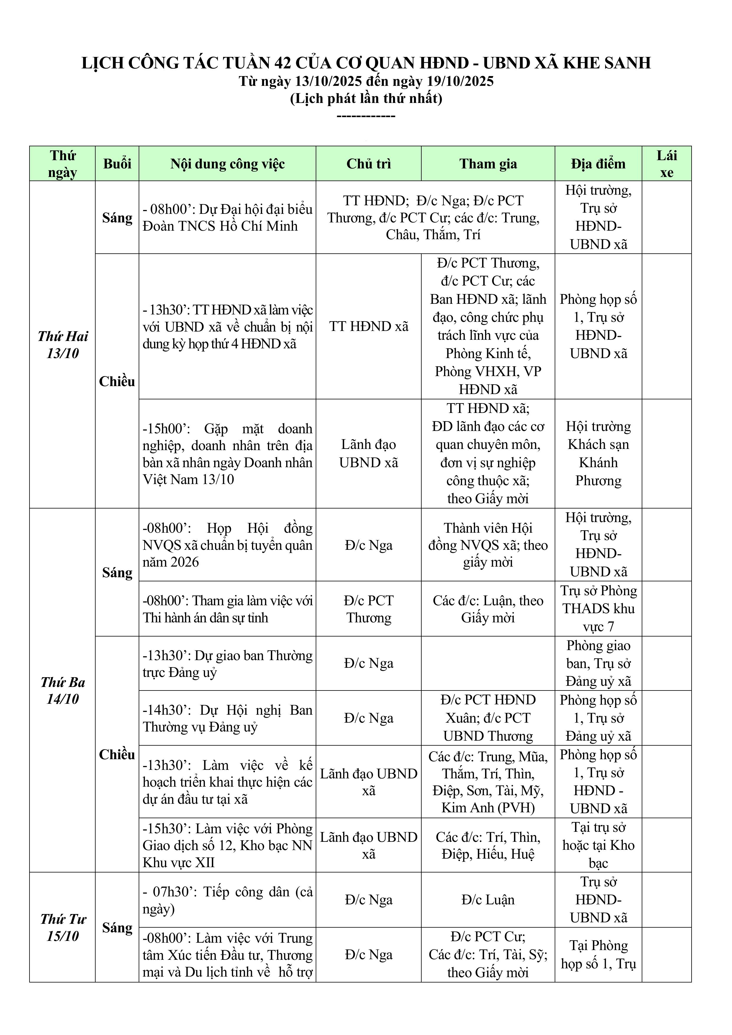 LỊCH CÔNG TÁC TUẦN 42 NĂM 2025 CỦA CƠ QUAN XÃ KHE SANH TỪ NGÀY 13/10 ĐẾN NGÀY 19/10