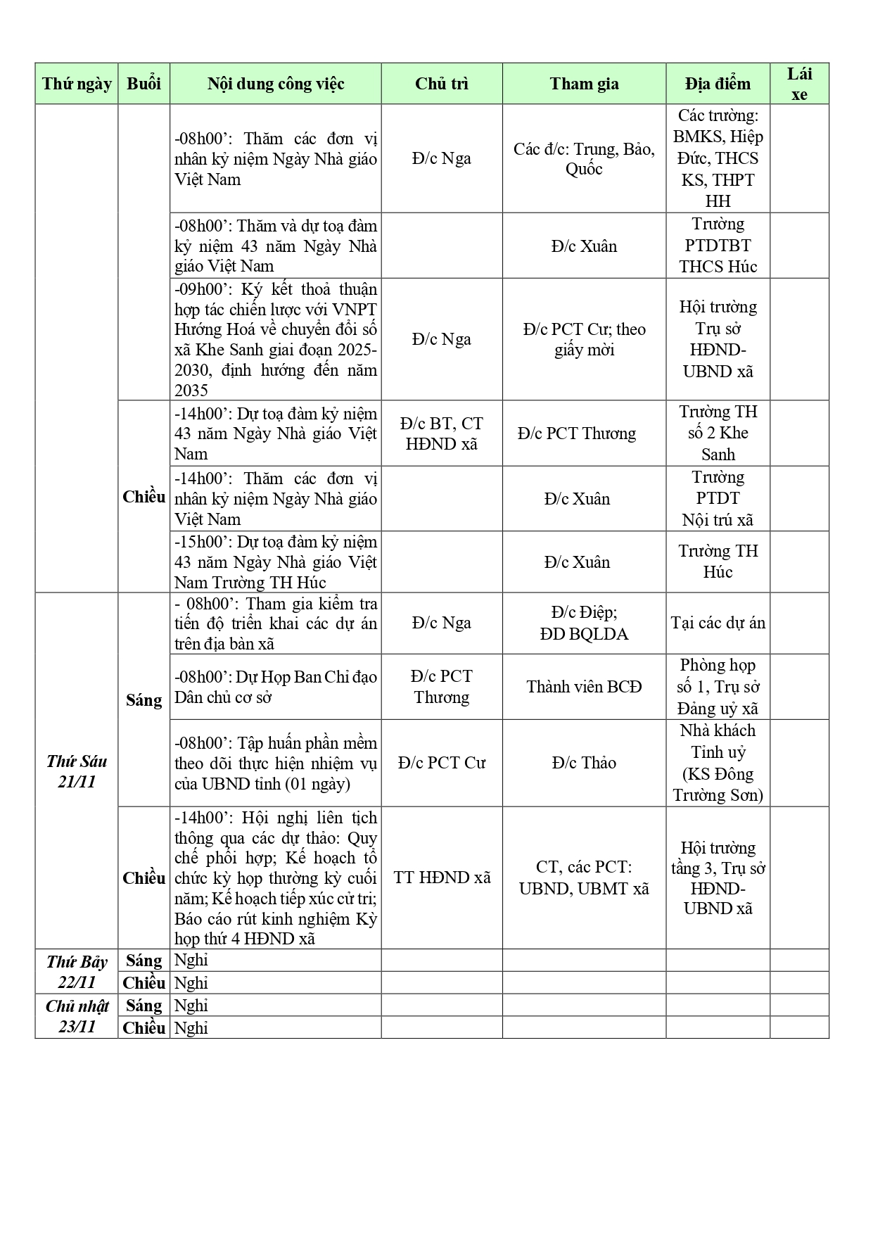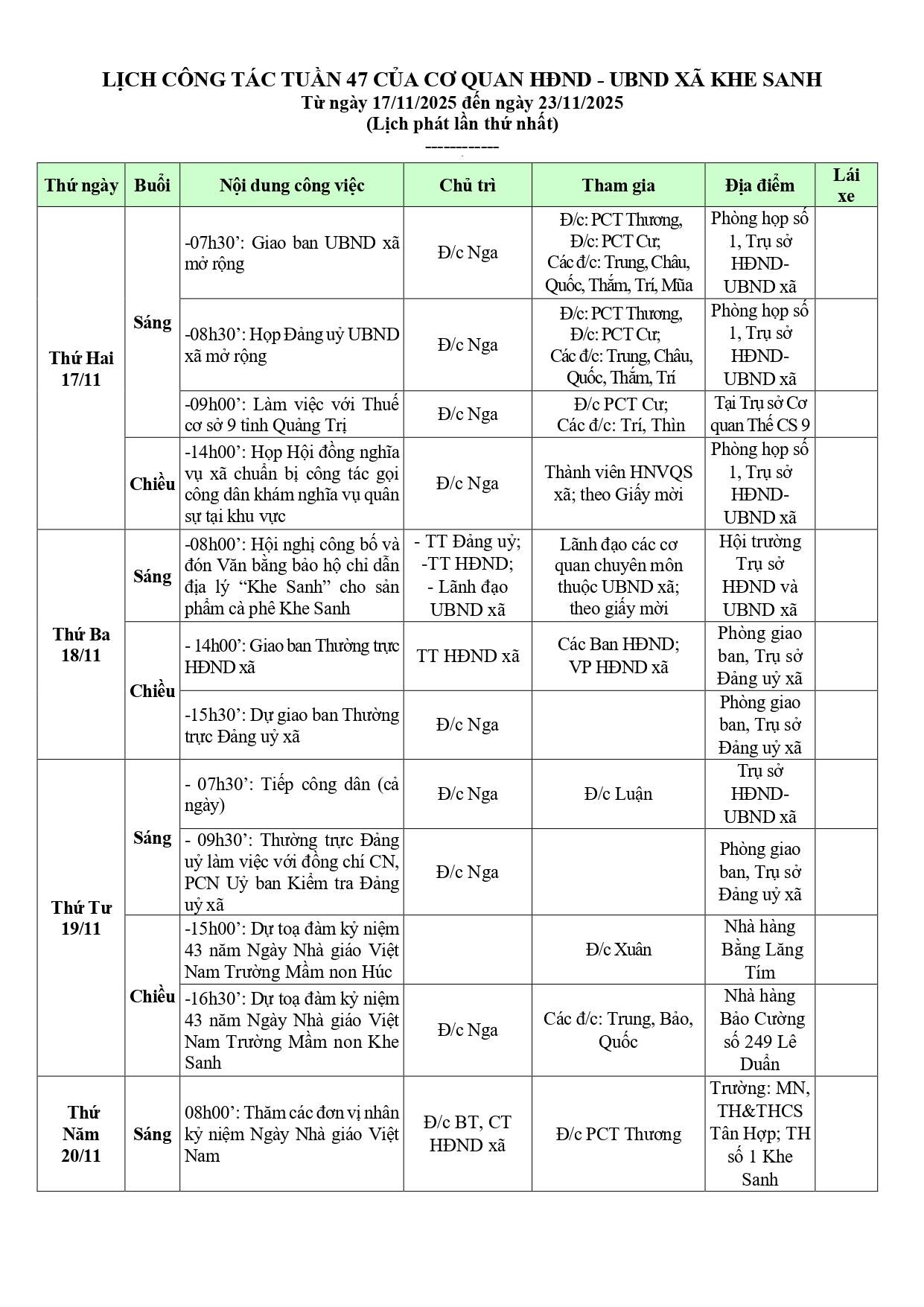 LỊCH TUẦN 47 CỦA CƠ QUAN HĐND - UBND XÃ KHE SANH