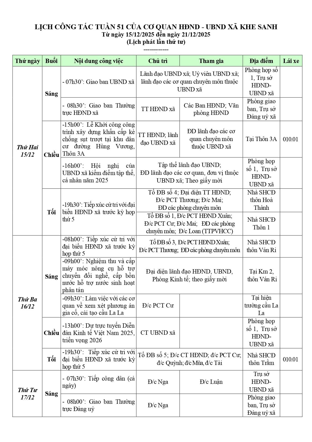 LỊCH TUẦN 51 CỦA CƠ QUAN HĐND - UBND XÃ KHE SANH