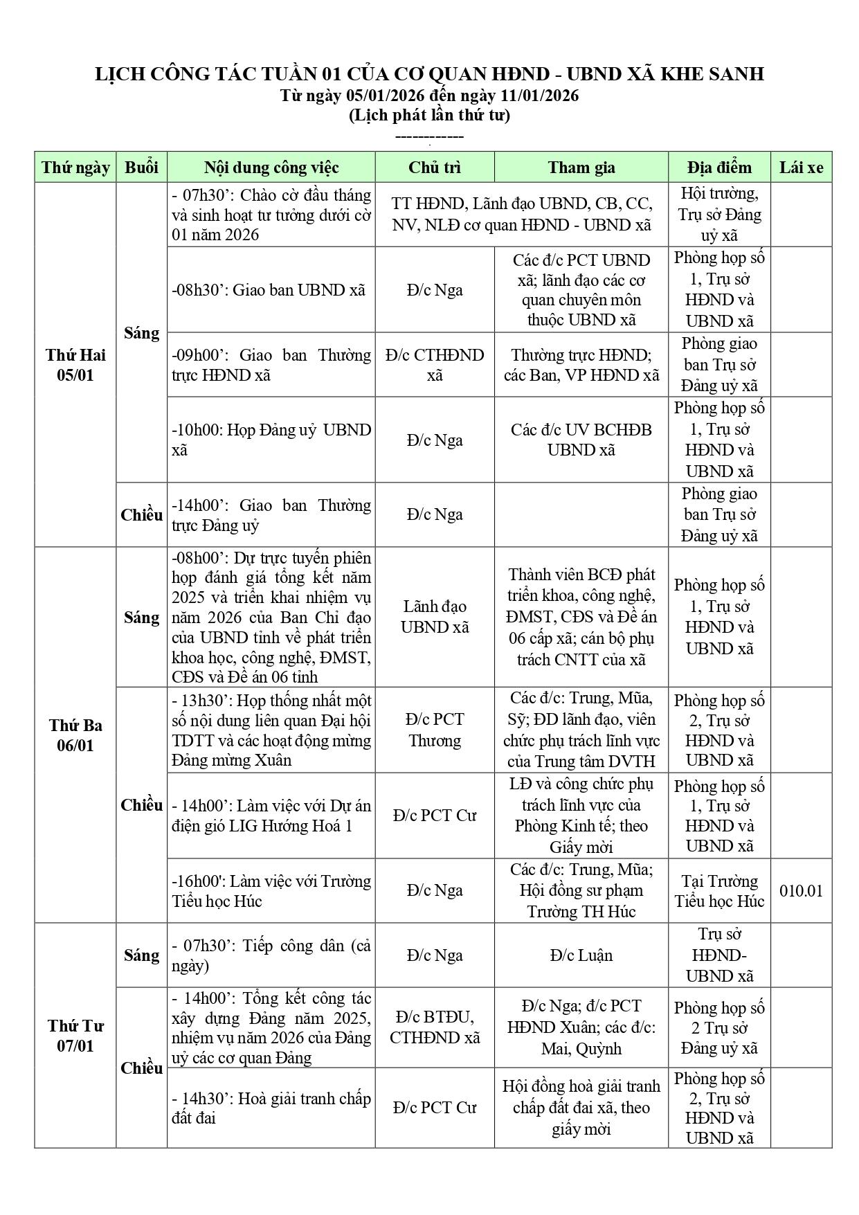 LỊCH TUẦN 01 CỦA CƠ QUAN HĐND - UBND XÃ KHE SANH