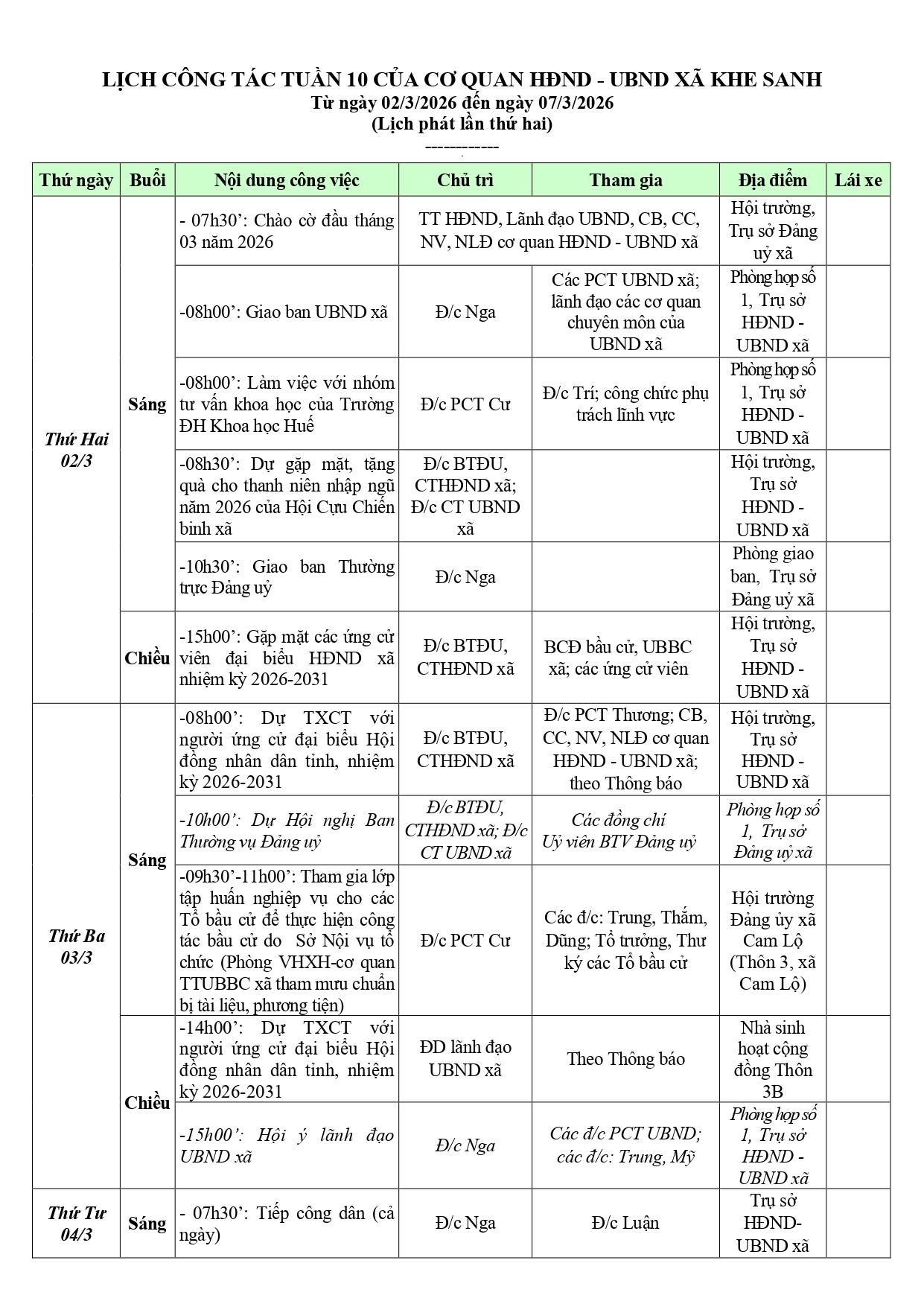 LỊCH TUẦN 10 CỦA CƠ QUAN HĐND - UBND XÃ KHE SANH