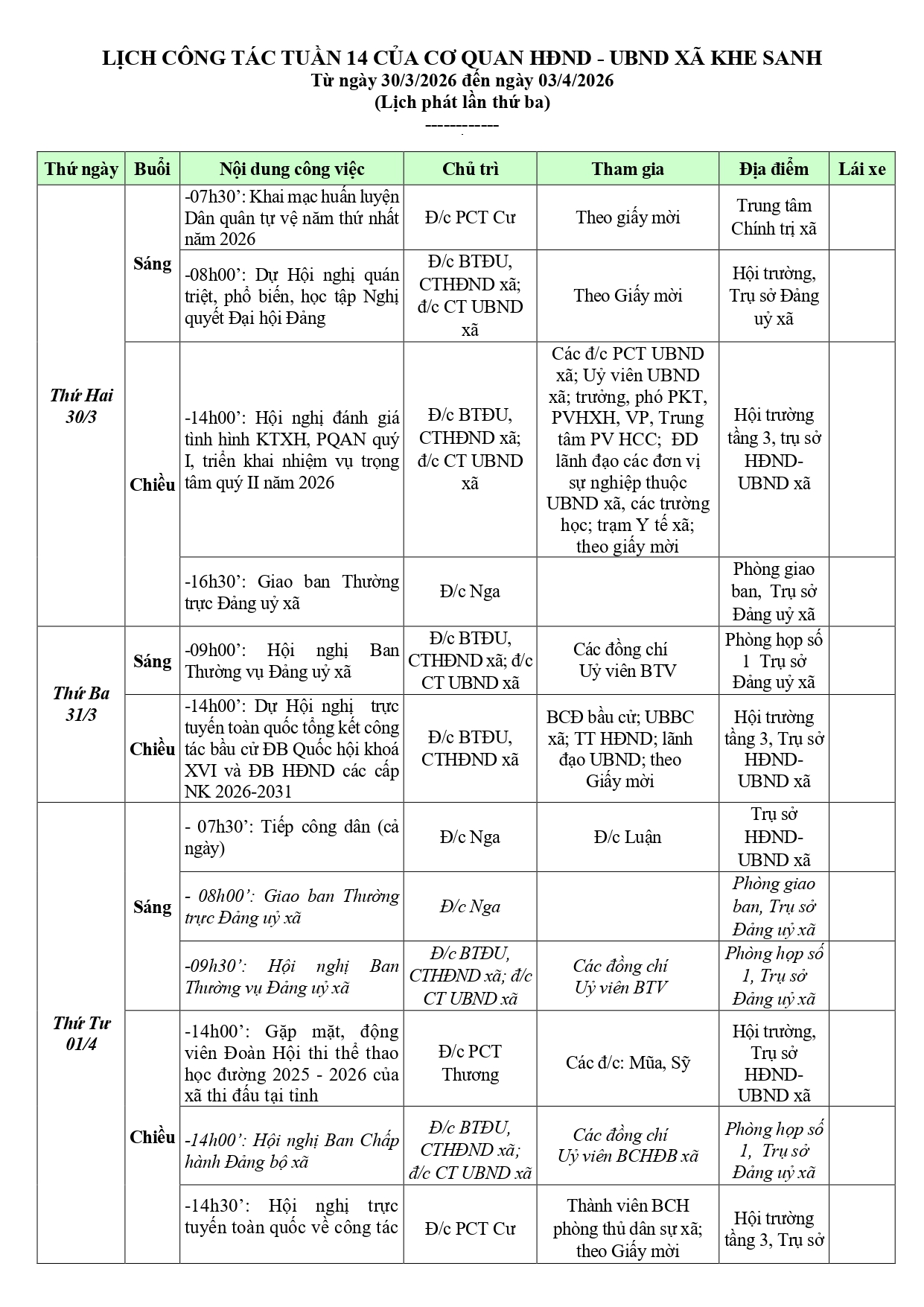 - LỊCH TUẦN 13 CỦA CƠ QUAN HĐND - UBND XÃ KHE SANH (24/03/2026)