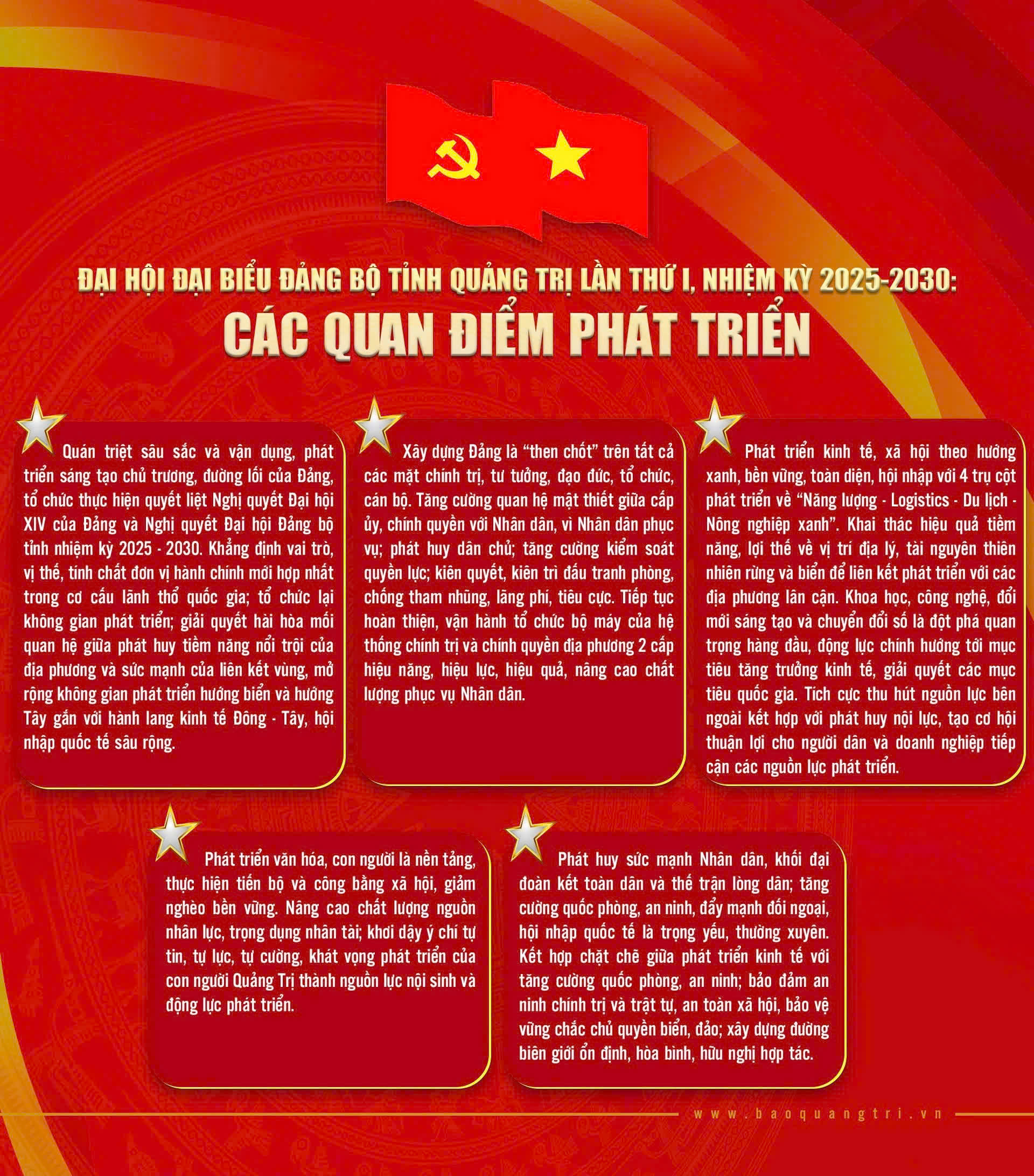 Bối cảnh tình hình đặt ra nhiều vấn đề mới, yêu cầu cao, đòi hỏi Đảng bộ và Nhân dân Quảng Trị phải tiếp tục đoàn kết phấn đấu, nỗ lực vươn lên để phát triển nhanh hơn, bền vững hơn. Theo đó, nhiệm kỳ 2025-2030, Đảng bộ tỉnh Quảng Trị xác định 5 quan điểm phát triển, nội dung như sau: