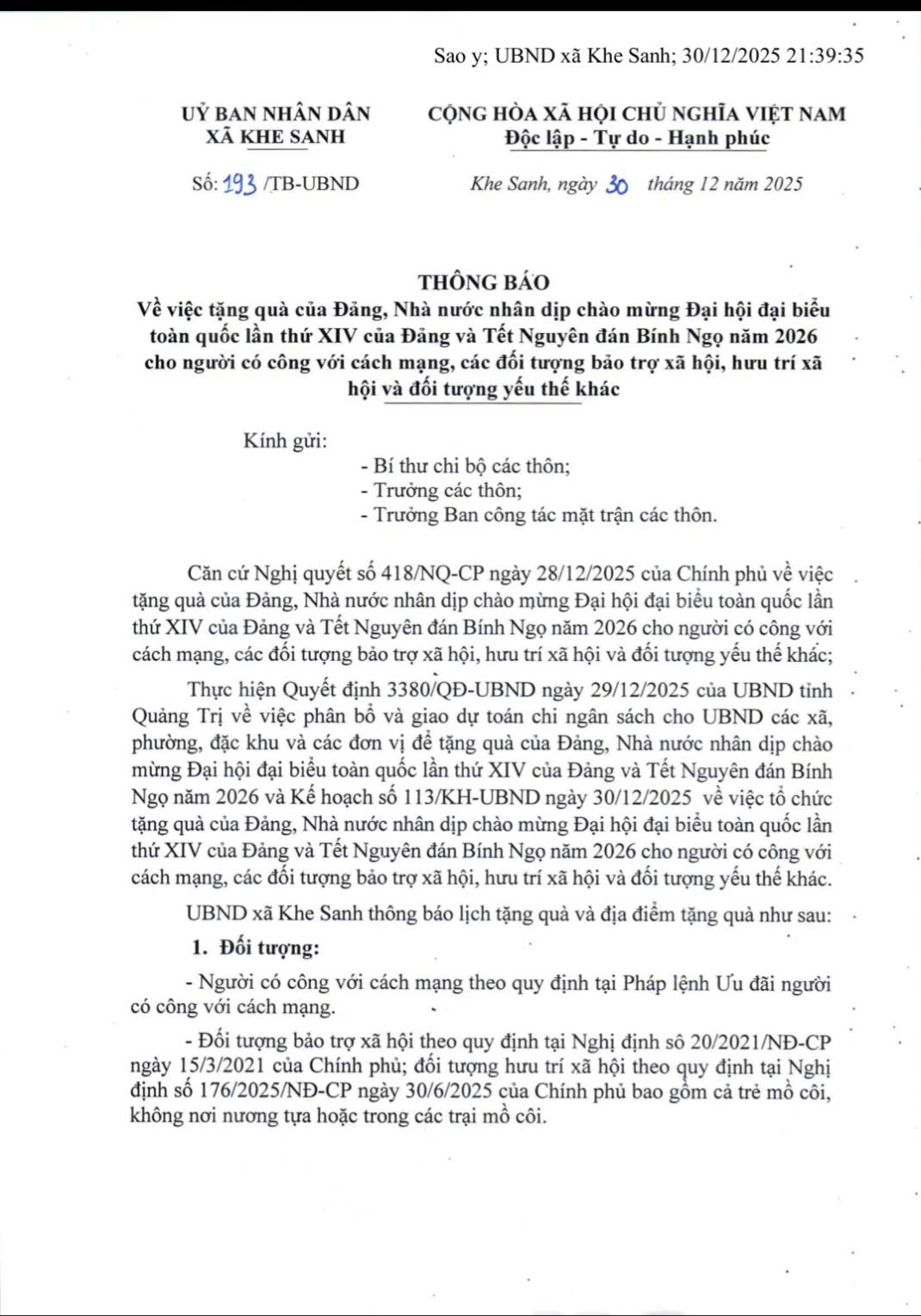 THÔNG BÁO! VỀ VIỆC ĐẢNG, NHÀ NƯỚC TẶNG QUÀ NHÂN DỊP CHÀO MỪNG ĐẠI HỘI ĐẢNG XIV VÀ TẾT NGUYÊN ĐÁN BÍNH NGỌ 2026