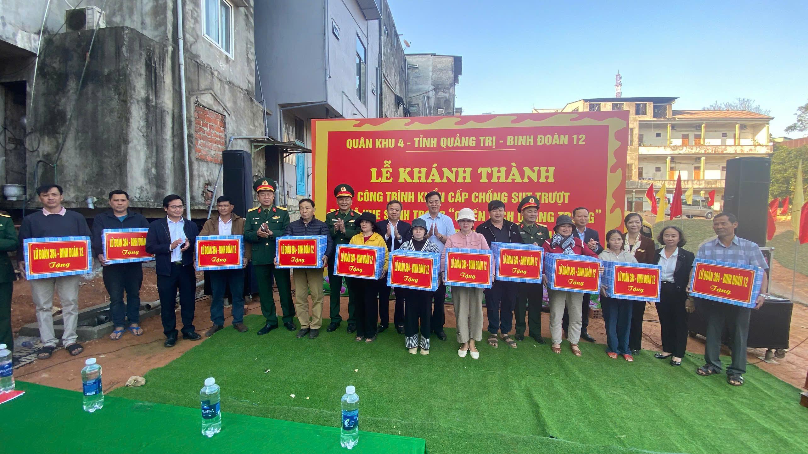 Nhân dịp này, các đồng chí lãnh đạo tỉnh, Lữ đoàn 384 – Binh đoàn 12, lãnh đạo xã Khe Sanh đã đã trao tặng các phần quà cho cán bộ, chiến sĩ tham gia thi công công trình; trao quà cho 12 hộ dân bị ảnh hưởng trực tiếp do sạt lở tại xã Khe Sanh.