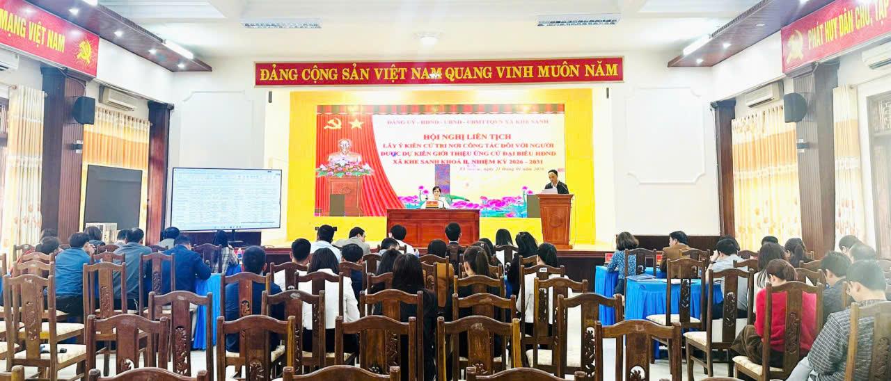 Ngày 21 tháng 1, Đảng uỷ - HĐND - UBND - Uỷ ban MTTQ Việt Nam xã Khe Sanh tổ chức Hội nghị liên tịch lấy ý kiến cử tri nơi công tác đối với những người dự kiến giới thiệu ứng cử đại biểu HĐND xã khóa II, nhiệm kỳ 2026 -2031. Đồng chí Nguyễn Triều Thương, Bí thư Đảng ủy, Chủ tịch HĐND xã chủ trì Hội nghị; Dự có Đồng chí Võ Khánh Minh, Phó Bí thư Thường trực Đảng uỷ; Đồng chí Thái Thị Nga, Phó Bí thư Đảng uỷ, Chủ tịch UBND xã; Các đồng chí trong BTVĐU, Thường trực HĐND, UBMD, UBMTTQ Việt Nam xã.