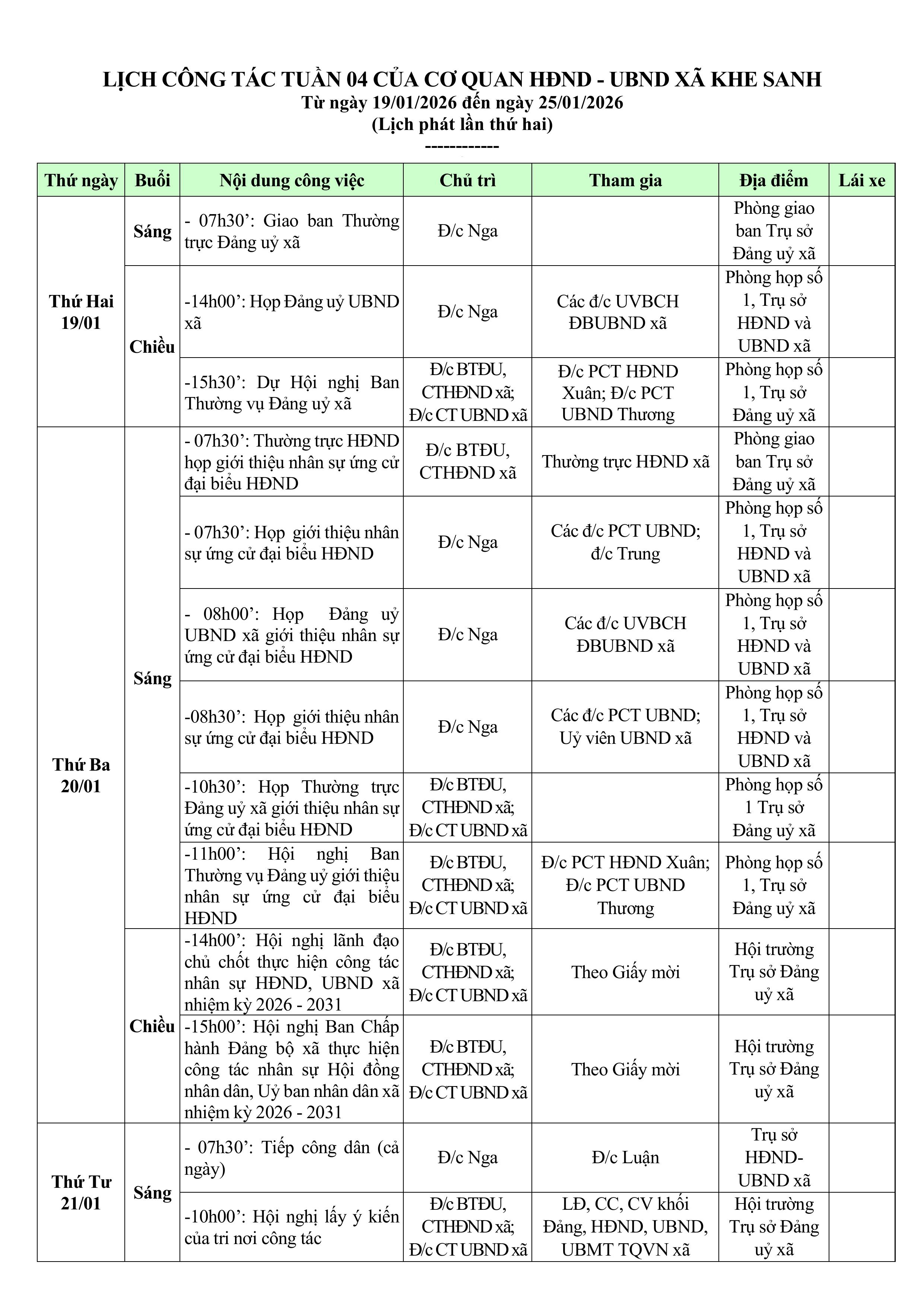 LỊCH TUẦN 04 CỦA CƠ QUAN HĐND - UBND XÃ KHE SANH