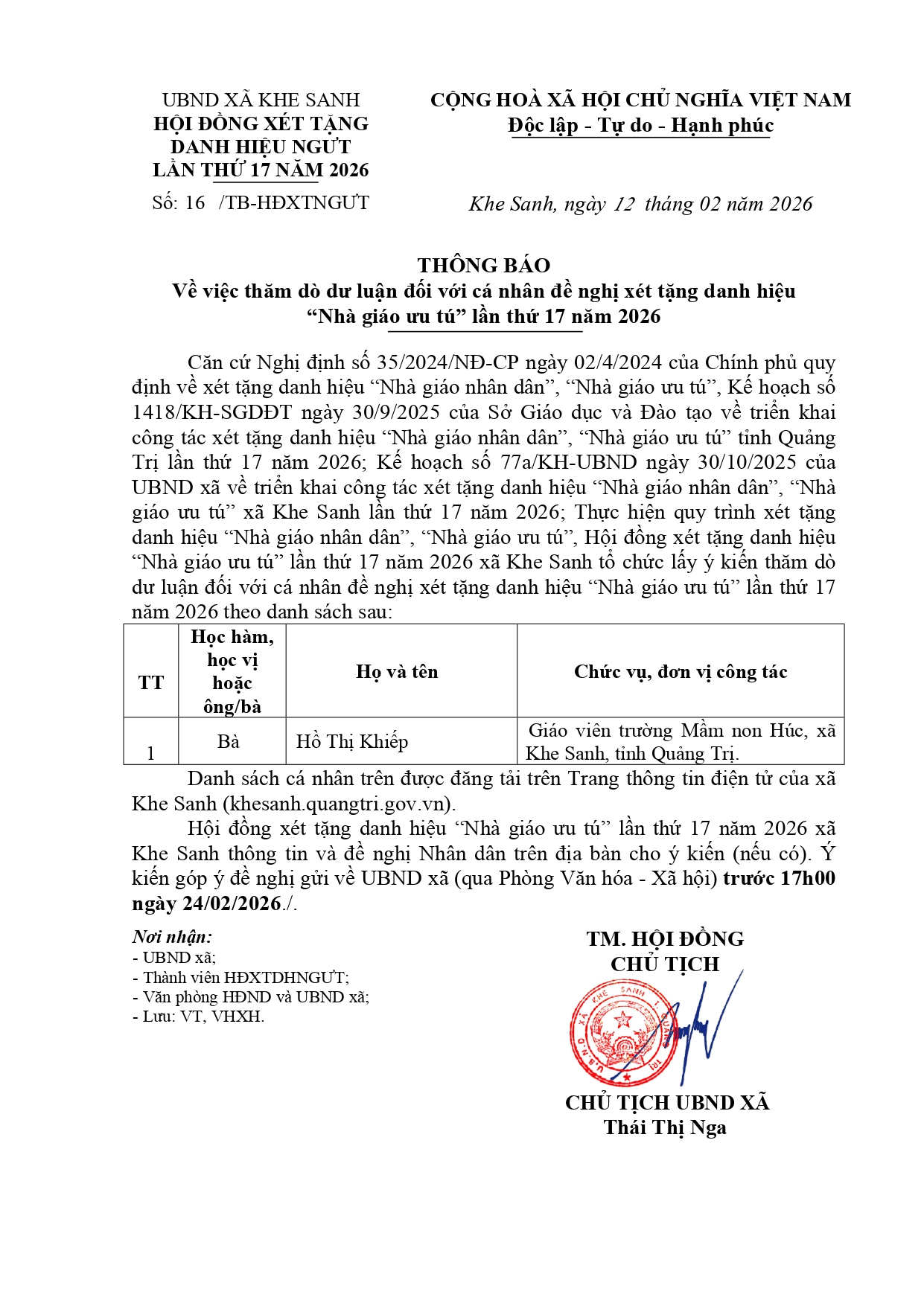 Thông báo về việc thăm dò dư luận đối với cá nhân đề nghị xét tặng danh hiệu "Nhà giáo ưu tú" lần thứ 17 năm 2026