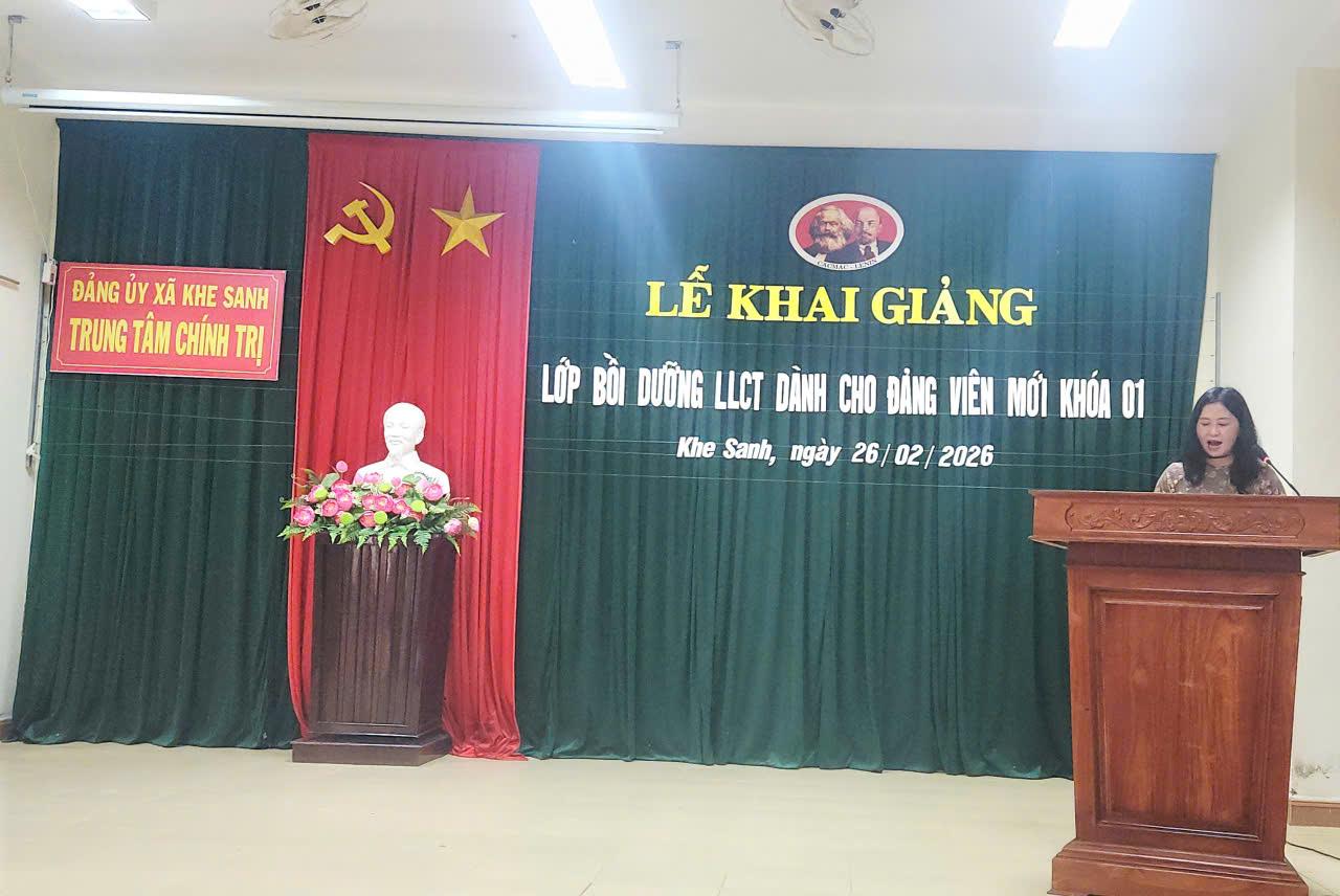 Sáng ngày 26/02/2026, Trung tâm chính trị xã Khe Sanh tổ chức khai giảng Lớp bồi dưỡng lý luận chính trị dành cho đảng viên mới khóa I, năm 2026. Tham dự có đại diện lãnh đạo các xã: Lao Bảo, Tân Lập, Lìa, Hướng Lập, Hướng Phùng, A Dơi. Về phía xã Khe Sanh có đồng chí Võ Khánh Minh, Phó Bí thư Thường trực Đảng ủy xã.