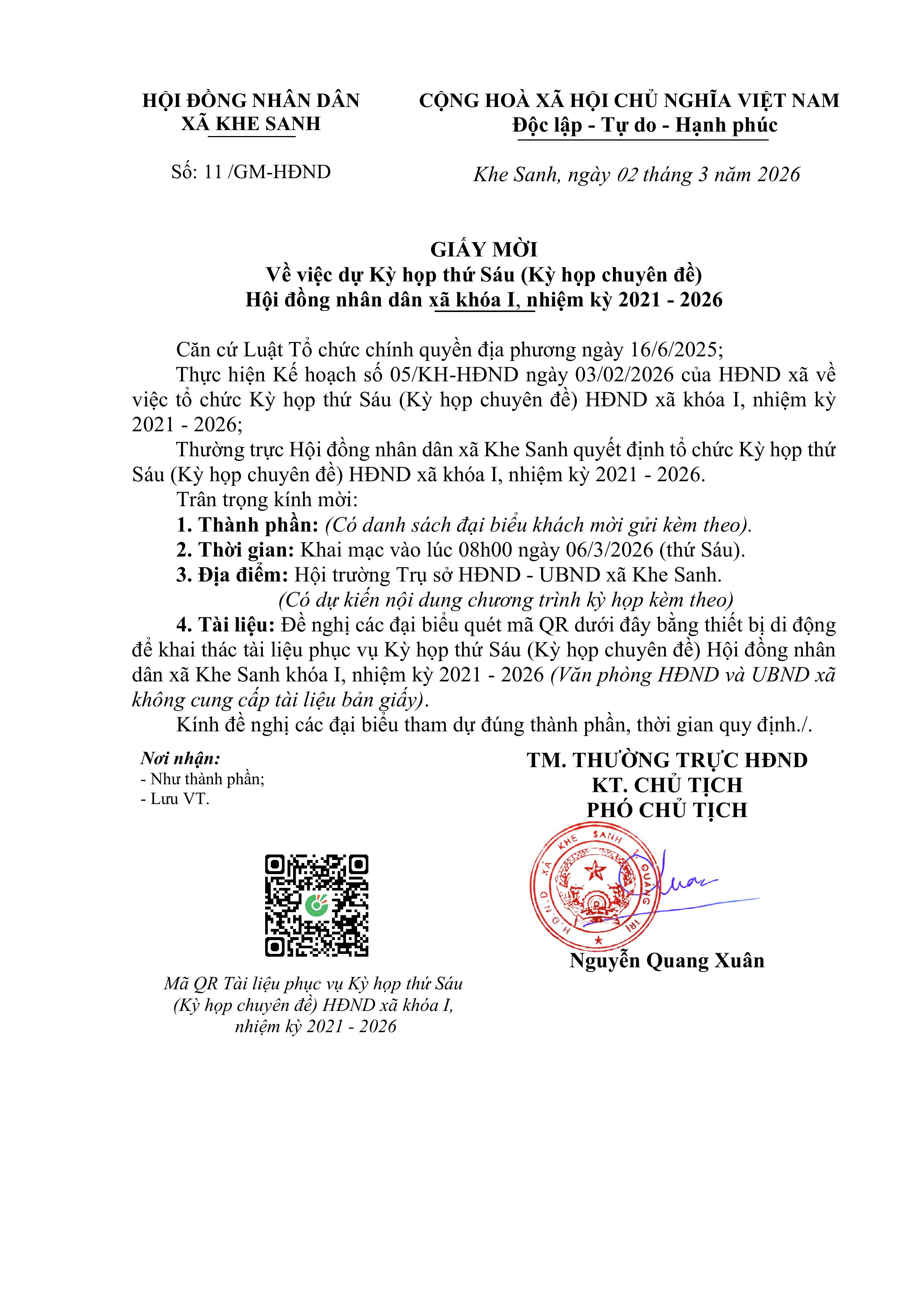Giấy mời kỳ họp thứ 6 HĐND xã khóa I, nhiệm kỳ 2021 - 2026