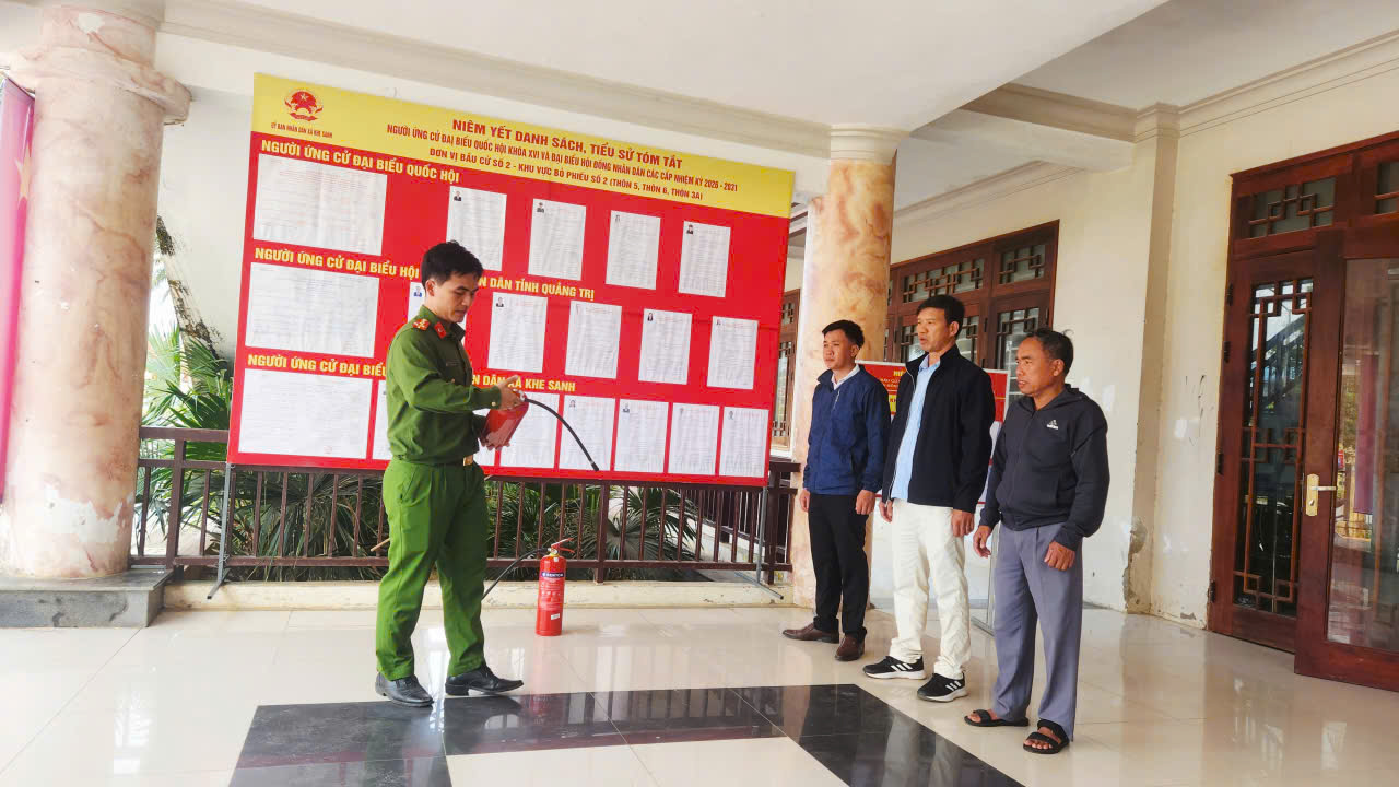 Hướng tới Cuộc bầu cử đại biểu Quốc hội khóa XVI và HĐND các cấp, nhiệm kỳ 2026 – 2031, nhằm bảo đảm tuyệt đối an toàn cho ngày hội lớn của toàn dân, Phòng Cảnh sát PCCC và CNCH, Công an tỉnh phối hợp với Công an xã Khe Sanh, chính quyền địa phương tổ chức kiểm tra, rà soát công tác bảo đảm an toàn PCCC và CNCH tại 09 điểm bầu cử trên địa bàn toàn xã.