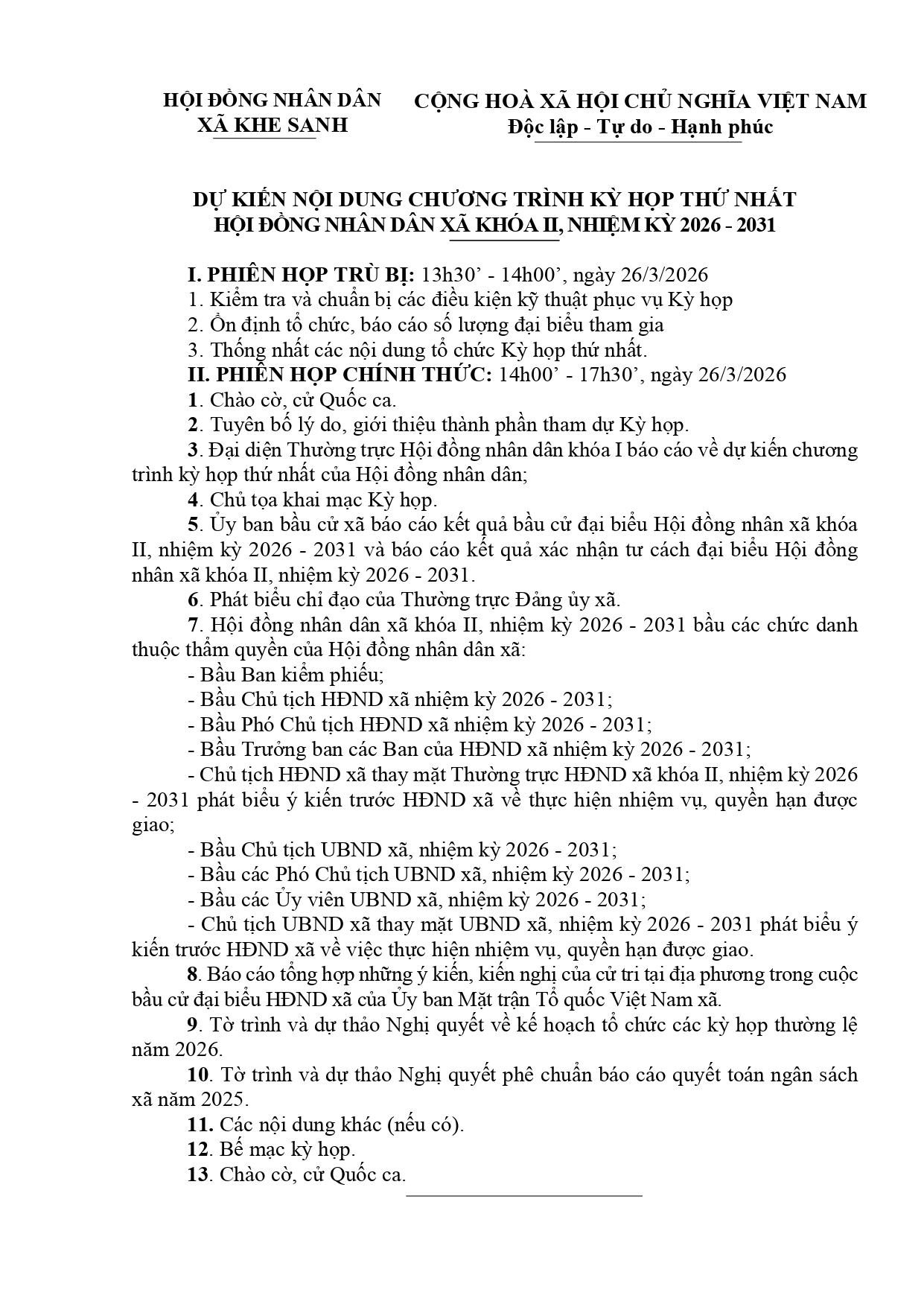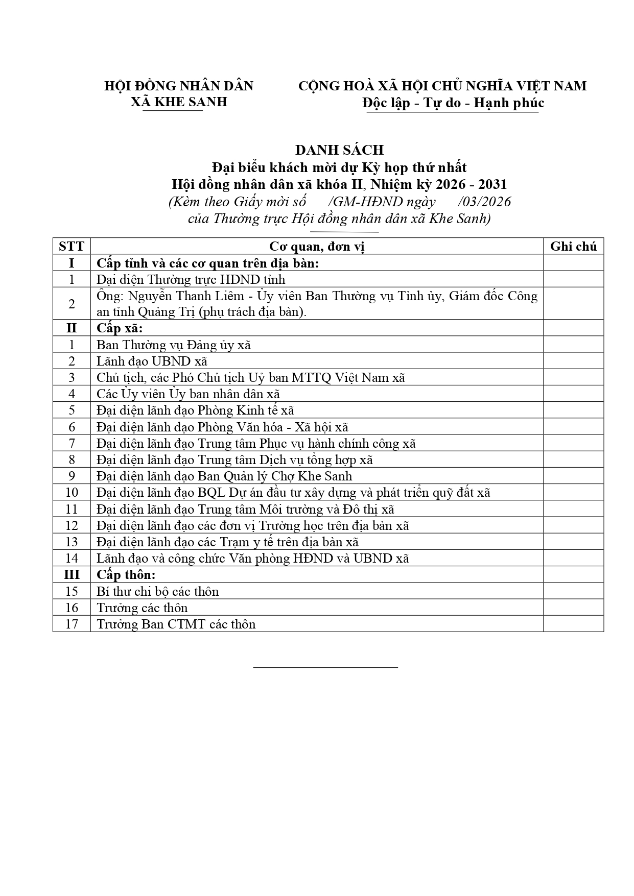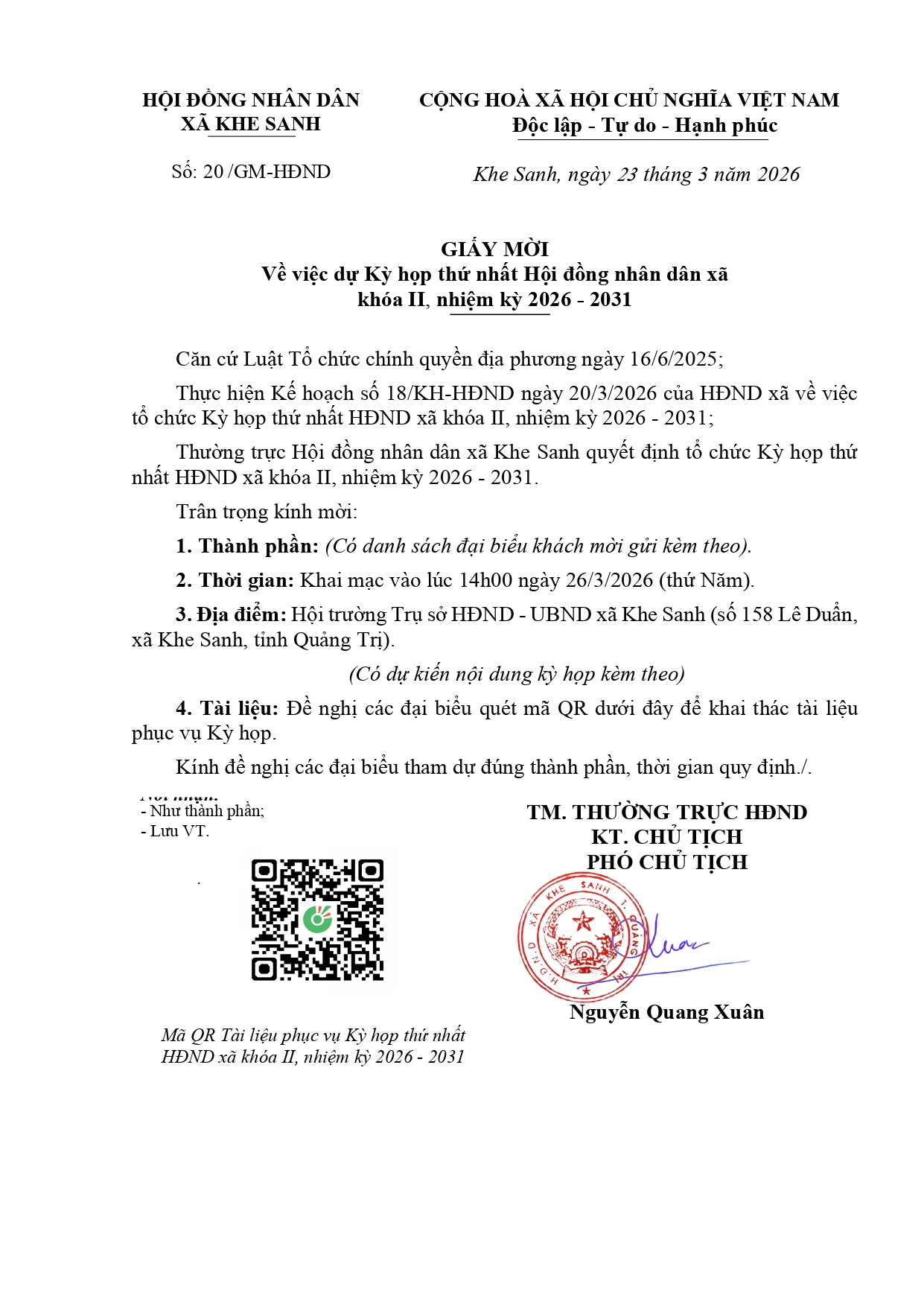Giấy mời về việc dự Kỳ họp thứ nhất HĐND xã khóa II, nhiệm kỳ 2026 - 2031