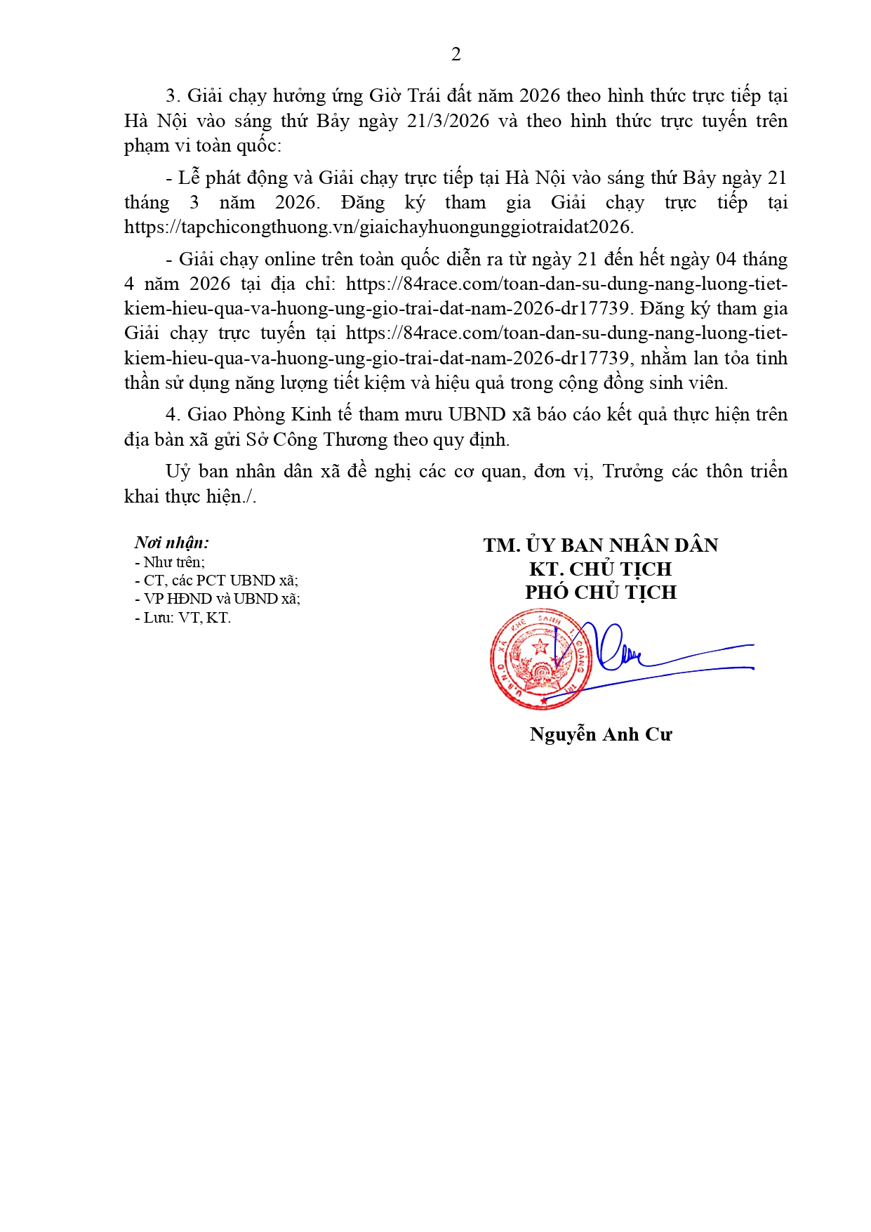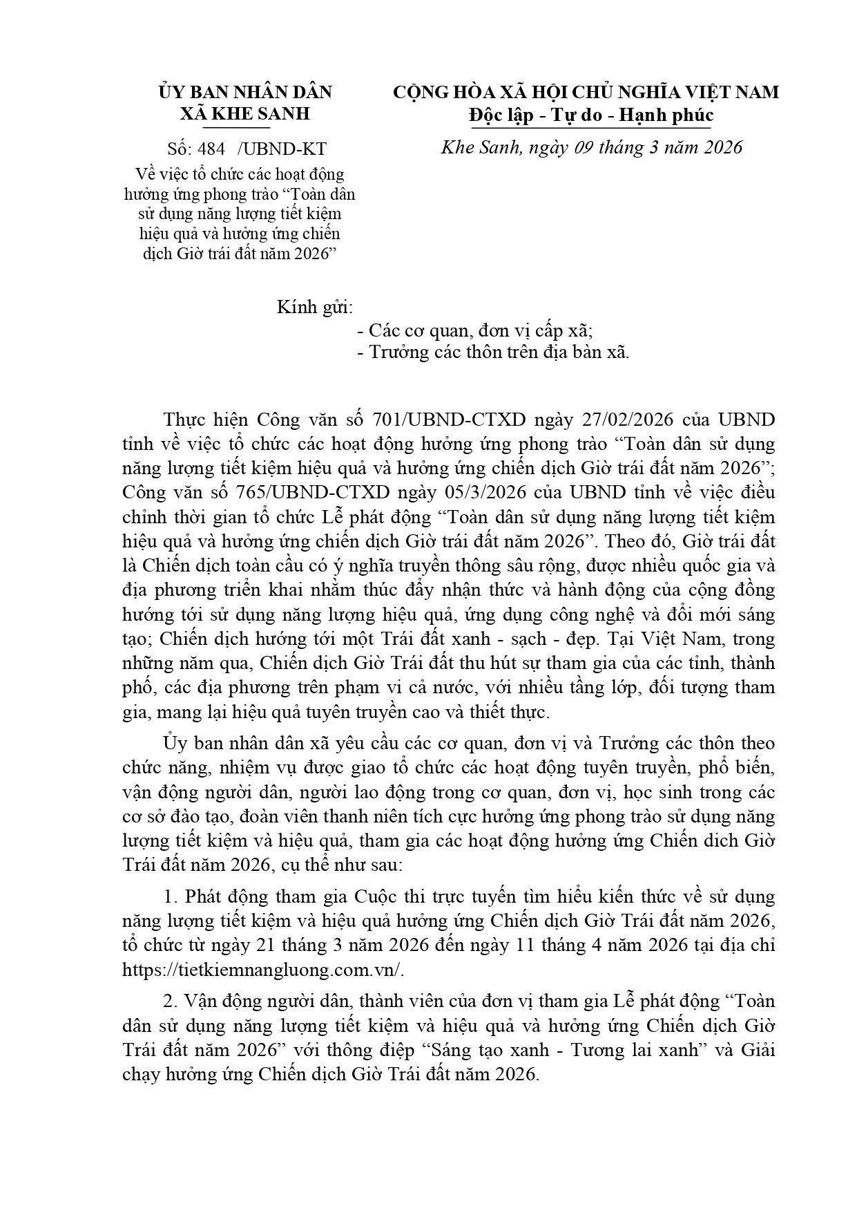 Công văn về việc tổ chức các hoạt động hưởng ứng phong trào "Toàn dân sử dụng năng lượng tiết kiệm hiệu quả và hưởng ứng chiến dịch Giờ trái đất năm 2026"