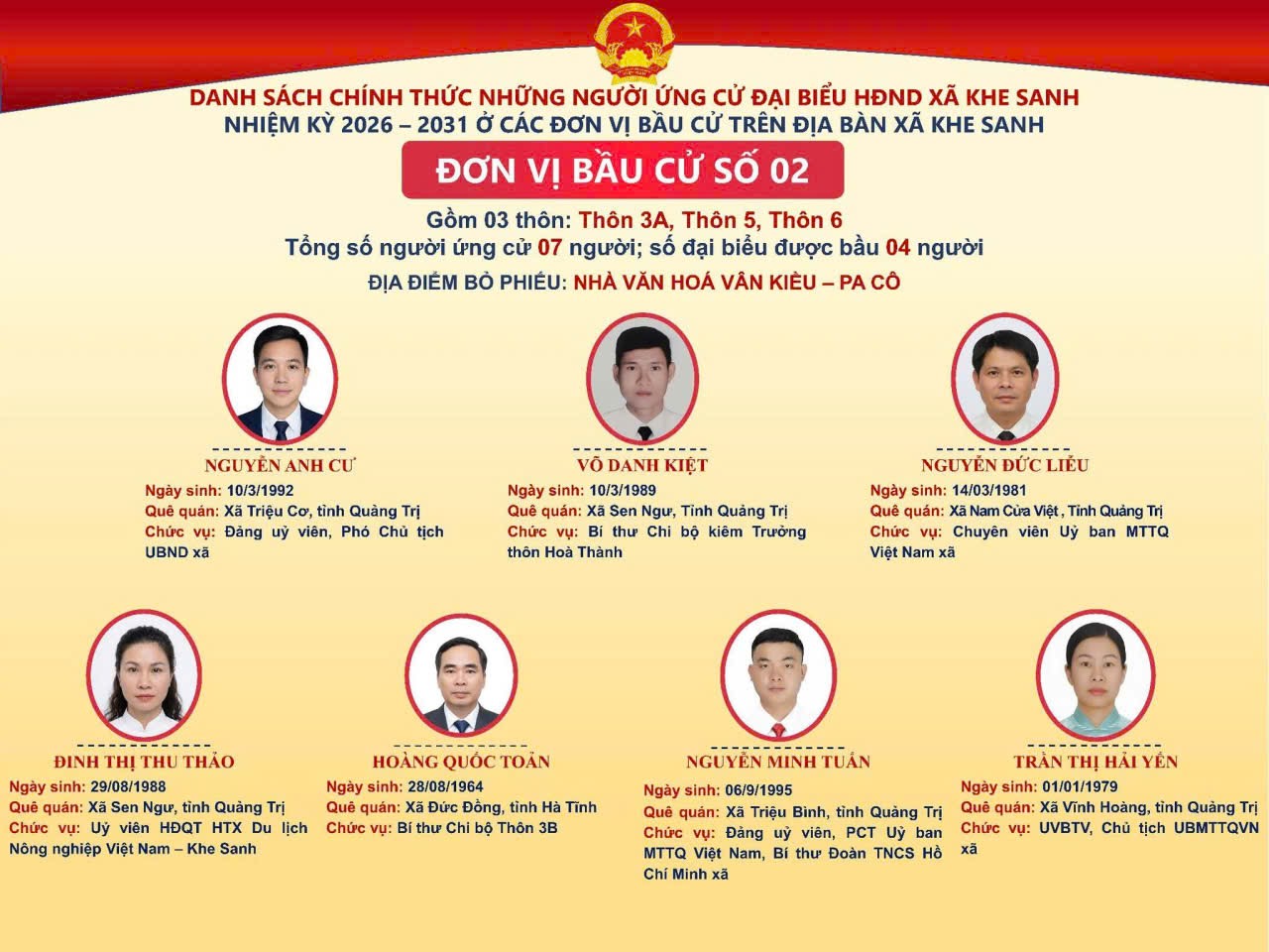 🎉🎉🎉UBBC xã Khe Sanh trân trọng giới thiệu tiểu sử tóm tắt những người ứng cử Đại biểu HĐND xã Khe Sanh nhiệm kỳ 2026 –2031 📍 Đơn vị bầu cử số 02 🏡 Gồm 03 thôn: Thôn 3A, Thôn 5, Thôn 6 🗓️Ngày 15-3-2026, cử tri cả nước đi bầu cử đại biểu Quốc hội khóa XVI và đại biểu Hội đồng nhân dân các cấp nhiệm kỳ 2026 - 2031! 🗓️ Sáng suốt lựa chọn người xứng đáng đại diện cho Nhân dân!
