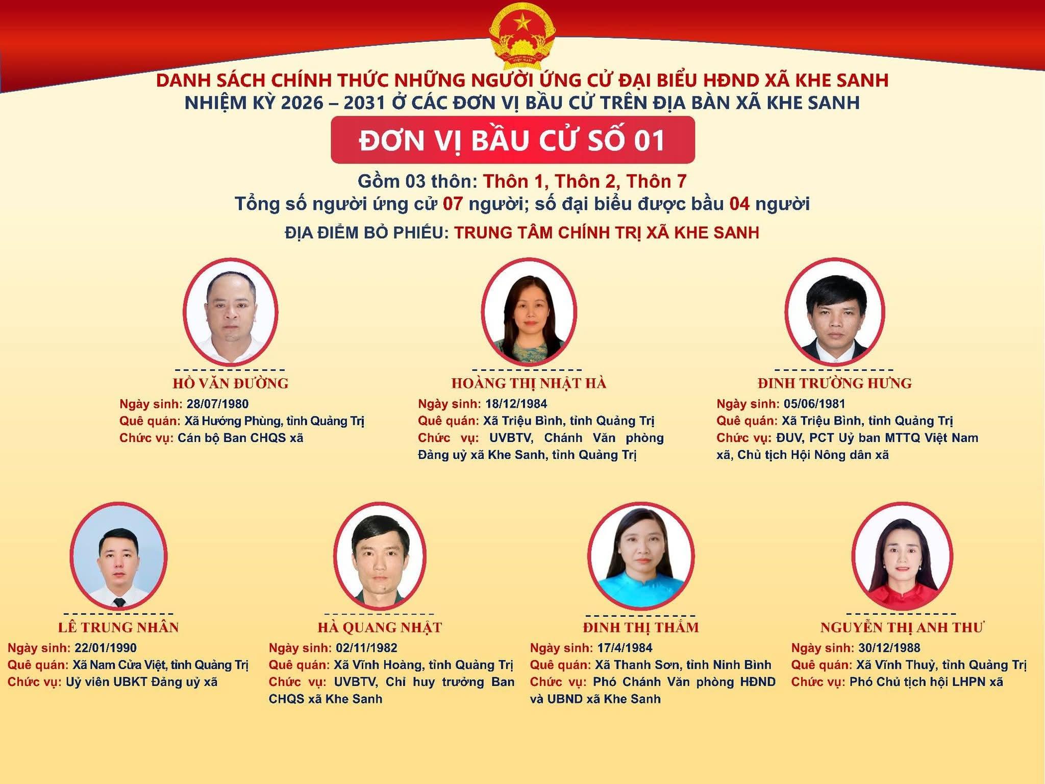 🎉🎉🎉UBBC xã Khe Sanh trân trọng giới thiệu tiểu sử tóm tắt những người ứng cử Đại biểu HĐND xã Khe Sanh nhiệm kỳ 2026 –2031 📍 Đơn vị bầu cử số 01 🏡 Gồm 03 thôn: Thôn 1, Thôn 2, Thôn 7 🗓️Mỗi lá phiếu là một niềm tin, một trách nhiệm đối với Tổ quốc! 🗓Sáng suốt lựa chọn những người đủ đức, đủ tài vào Quốc hội và Hội đồng nhân dân! Ngày 15-3-2026, cử tri cả nước đi bầu cử đại biểu Quốc hội khóa XVI và đại biểu Hội đồng nhân dân các cấp nhiệm kỳ 2026 - 2031!