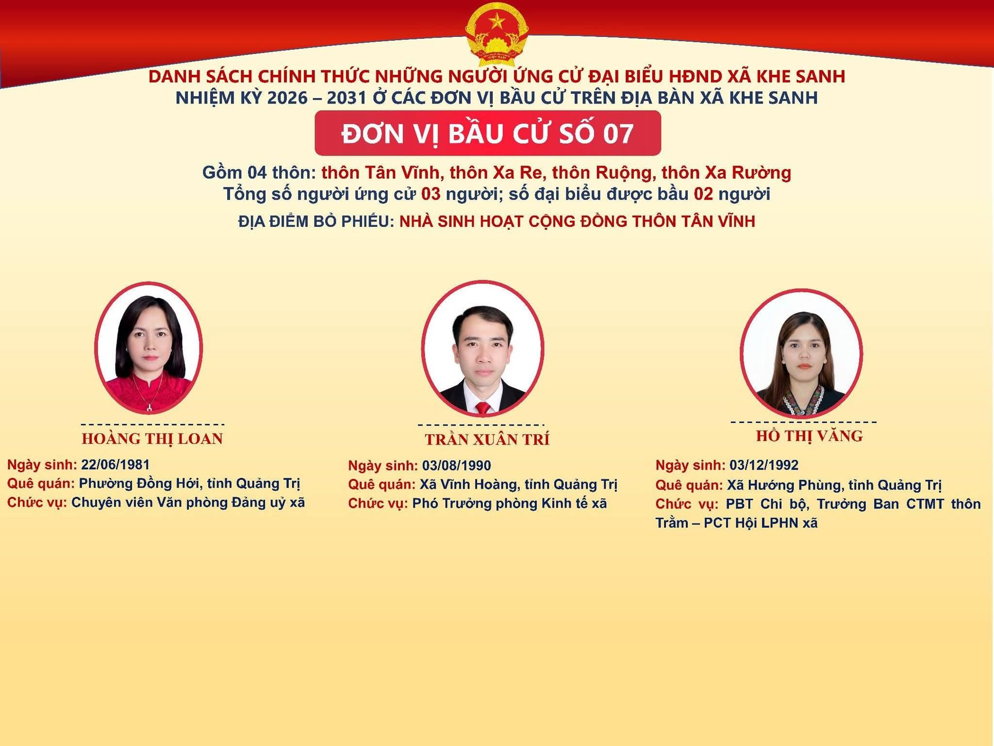 🎉🎉🎉UBBC xã Khe Sanh trân trọng giới thiệu tiểu sử tóm tắt những người ứng cử Đại biểu HĐND xã Khe Sanh nhiệm kỳ 2026 –2031 📍 Đơn vị bầu cử số 07 🏡 Gồm 04 thôn: Thôn Tân Vĩnh, Thôn Xa Re, Thôn Ruộng, Thôn Xa Rường 🗓️Mỗi lá phiếu là một niềm tin, một trách nhiệm đối với Tổ quốc! 🗓Ngày 15-3-2026, cử tri cả nước đi bầu cử đại biểu Quốc hội khóa XVI và đại biểu Hội đồng nhân dân các cấp nhiệm kỳ 2026 - 2031!