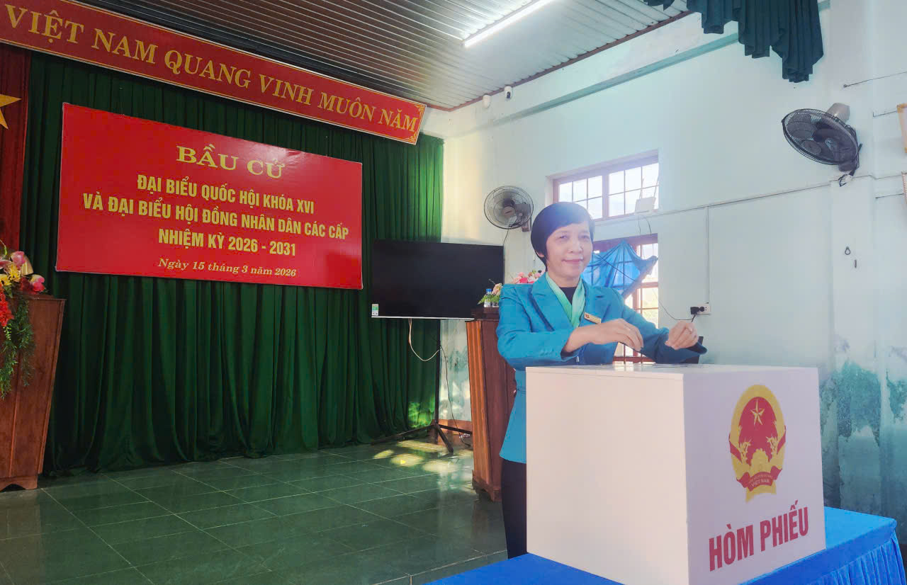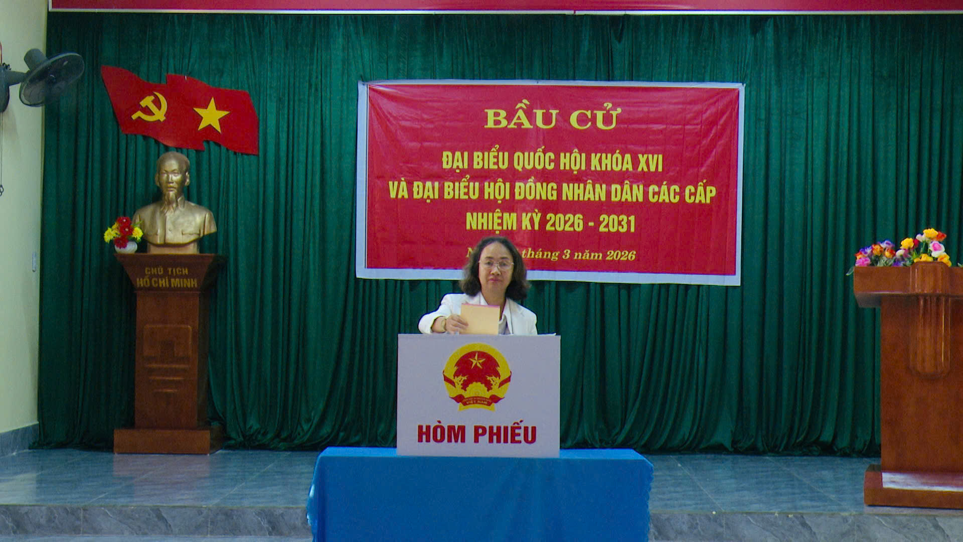 Đồng chí Chủ tịch UBND xã Thái Thị Nga tham gia bỏ phiếu tại điểm bầu cử số 09