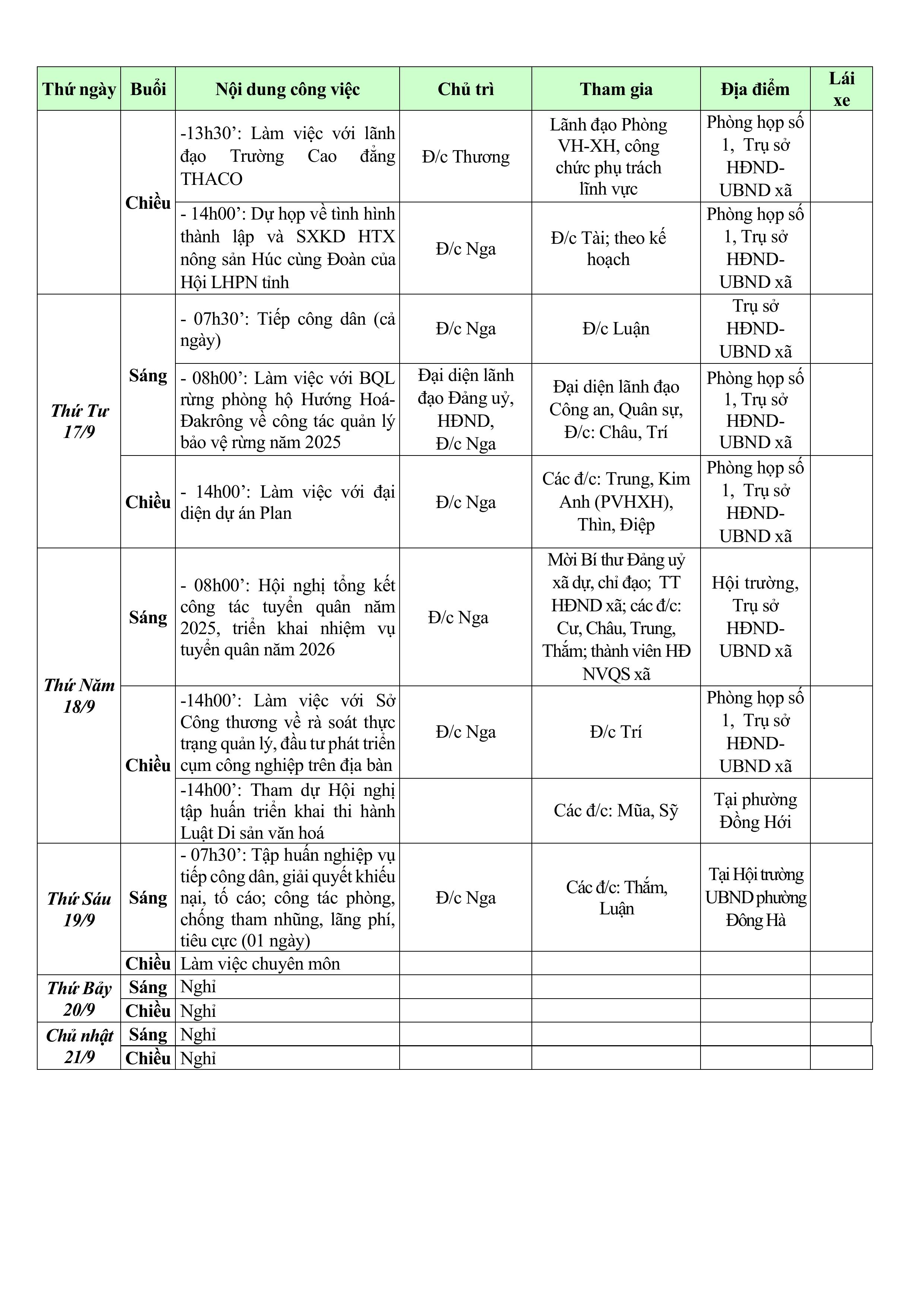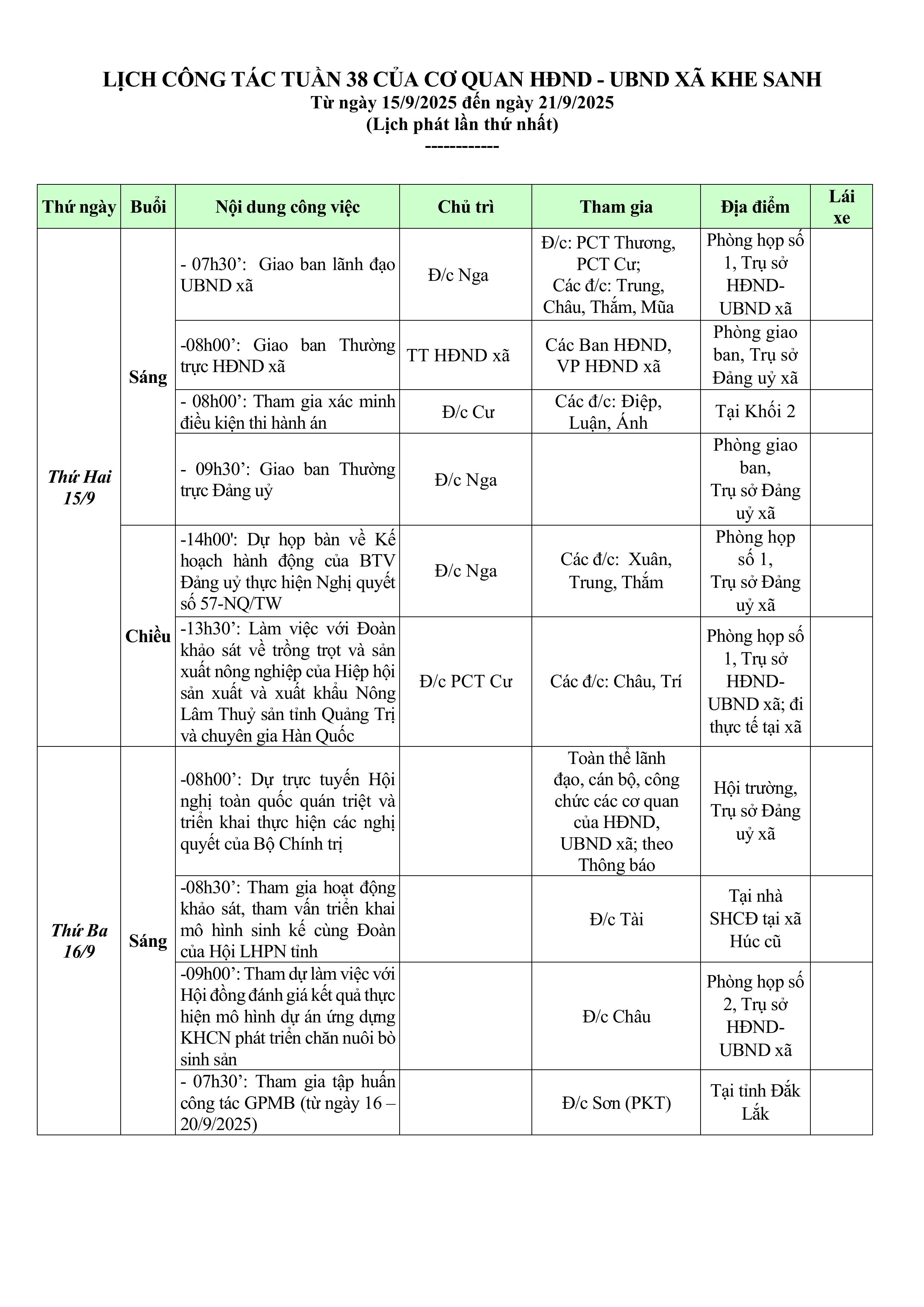 LỊCH CÔNG TÁC TUẦN 38 NĂM 2025 CỦA CƠ QUAN XÃ KHE SANH TỪ NGÀY 15/9 ĐẾN NGÀY 21/9