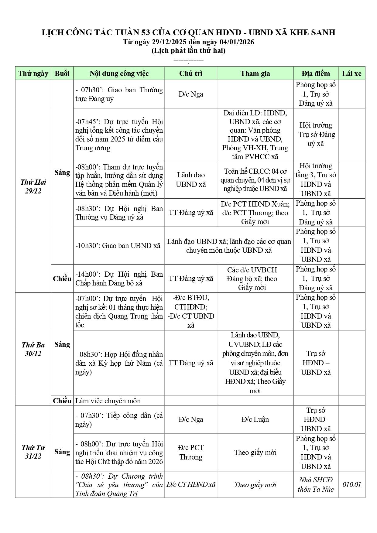 LỊCH TUẦN 53 CỦA CƠ QUAN HĐND - UBND XÃ KHE SANH