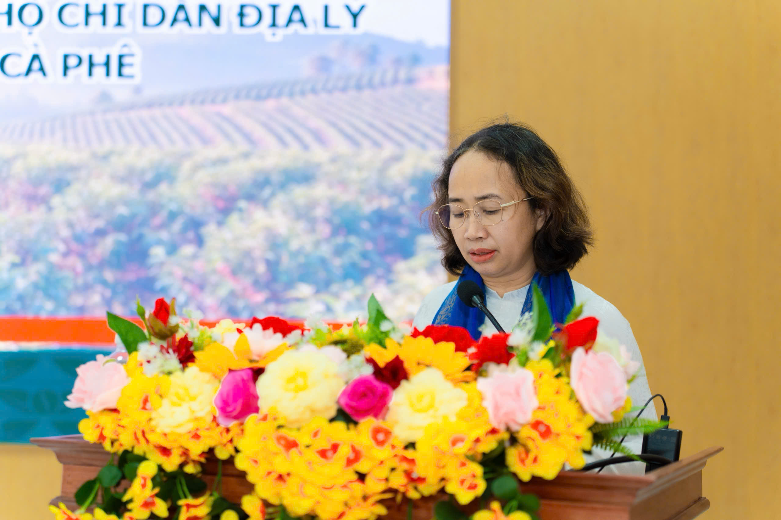 Đồng chí Chủ tịch UBND xã Khe Sanh Thái Thị Nga phát biểu, khẳng định vai trò của việc bảo hộ chỉ dẫn địa lý cho sản phẩm cà phê Khe Sanh