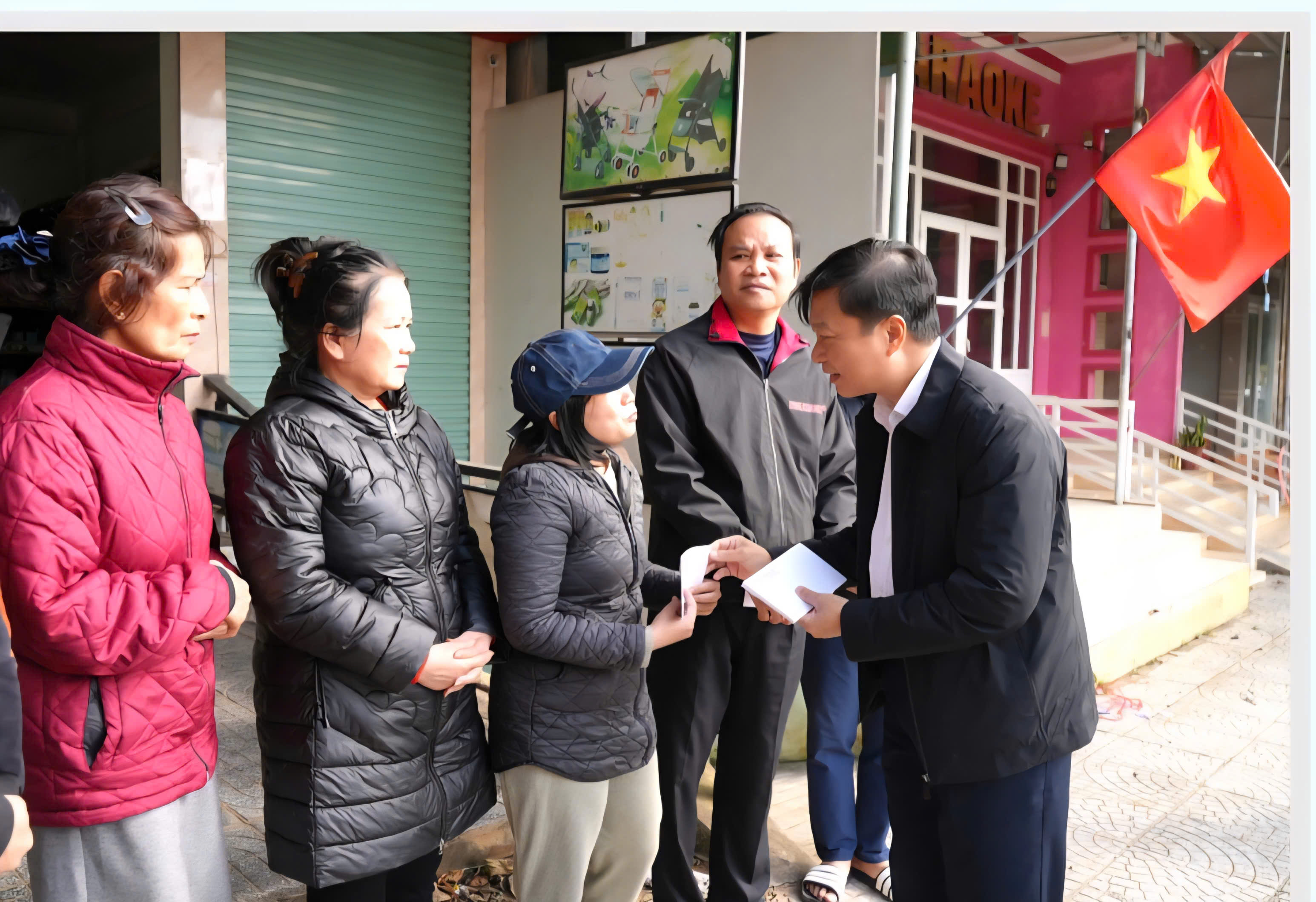 Đồng chí Chủ tịch UBND động viên, chia sẻ khó khăn với các hộ dân có nhà ở bị ảnh hưởng do sạt lở, sụt trượt