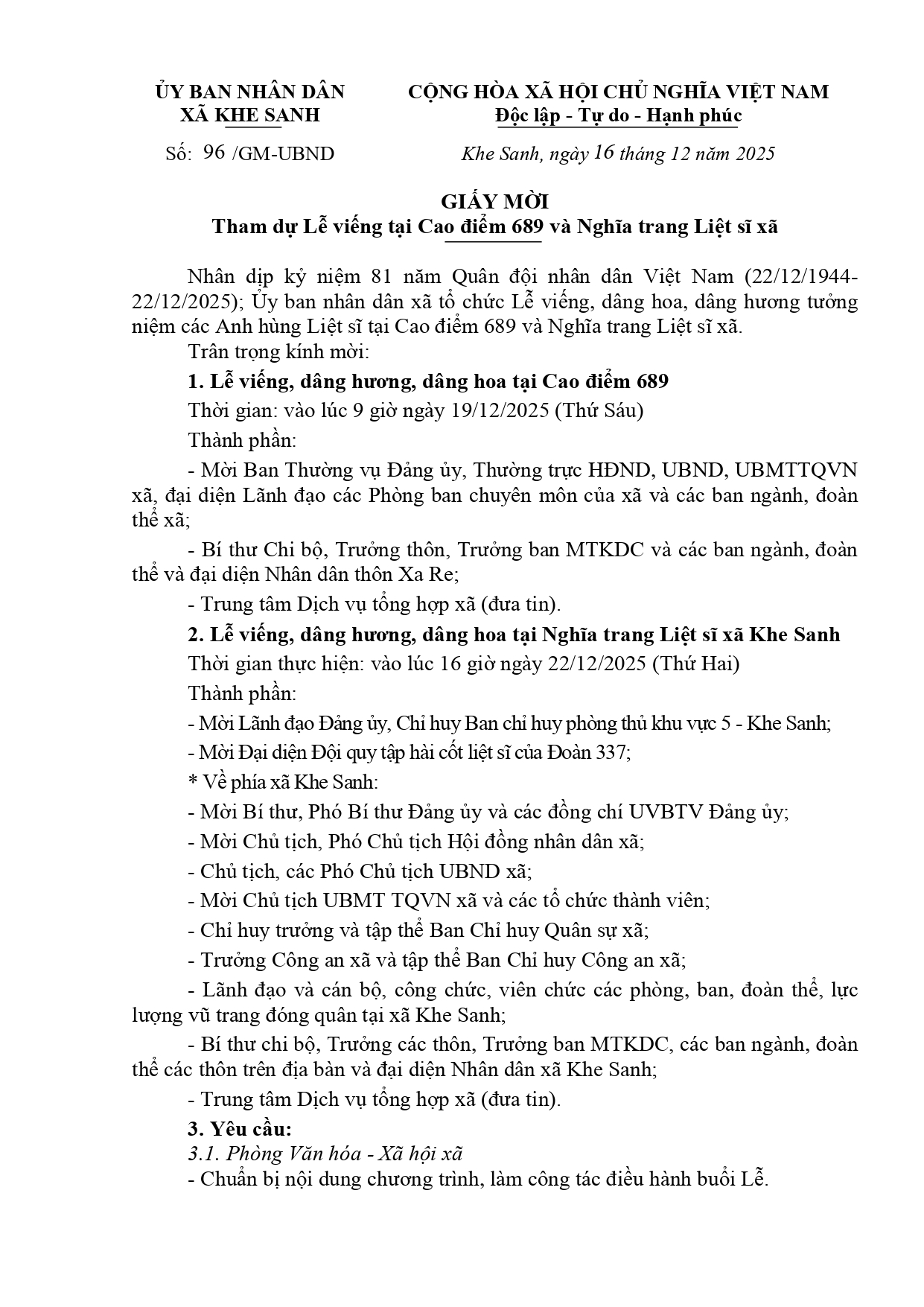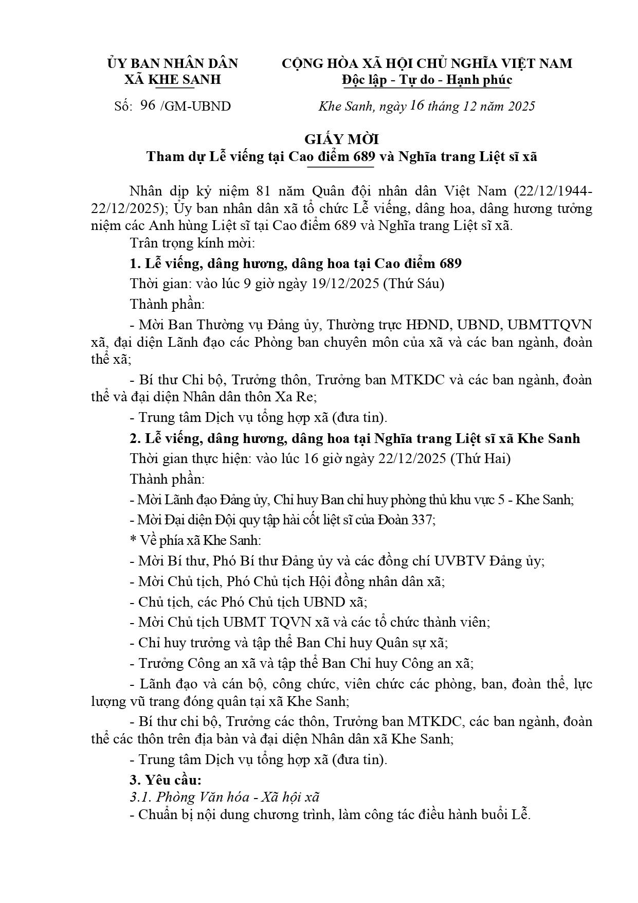 Giấy mời tham dự Lễ viếng tại Cao điểm 689 và Nghĩa trang Liệt sĩ xã