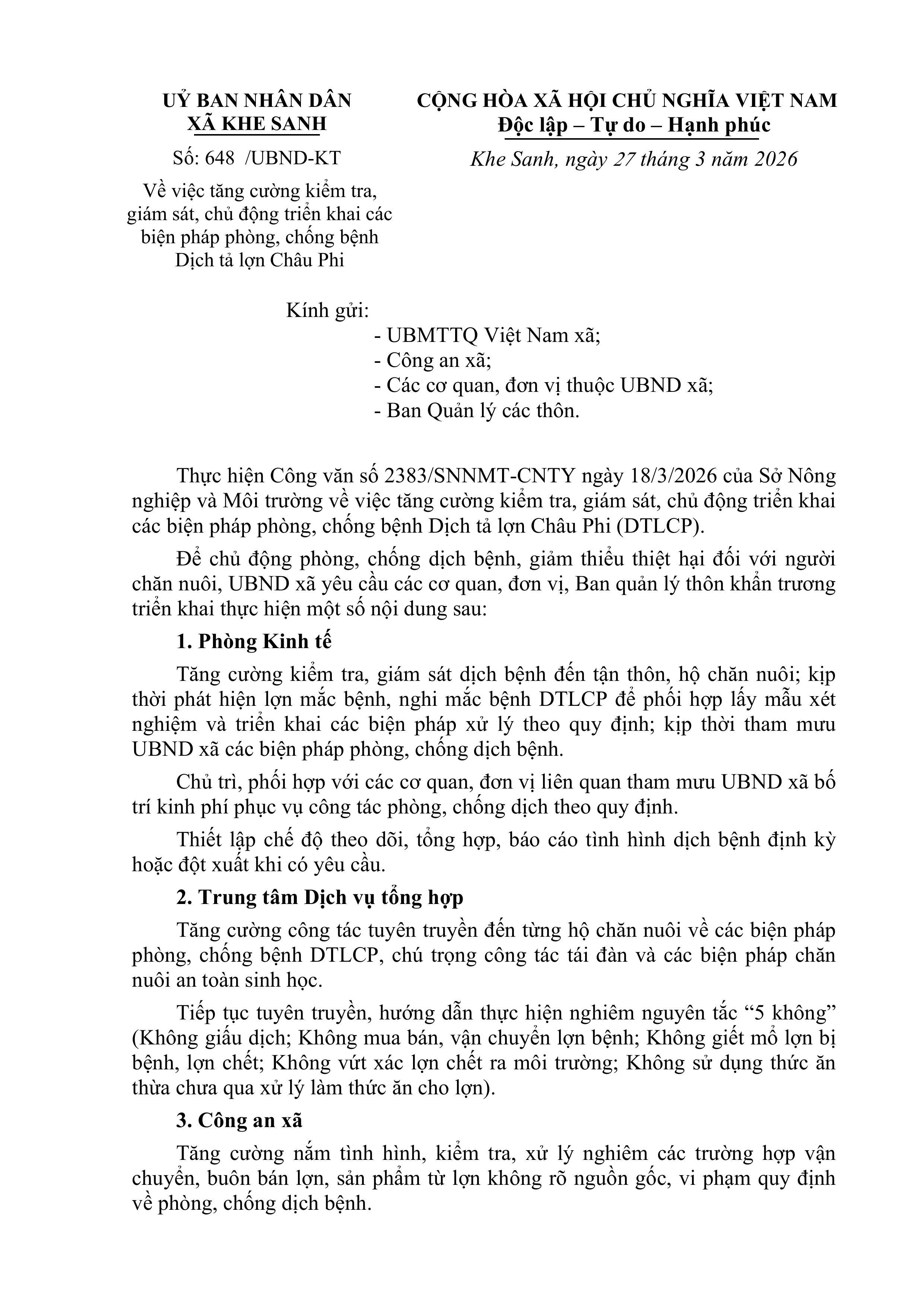 Công văn về việc tăng cường kiểm tra, giám sát, chủ động triển khai các biện pháp phòng, chống bệnh Dịch tả lợn Châu Phi